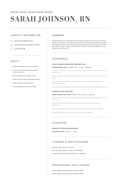Choose the right format to avoid confusion with your professional experience and skills. Get the employer’s attention by using action words and selected keywords that apply to the job opening. Finally, take advantage of our free resume-building tools to help you add expert suggestions in seconds and avoid getting ignored when you apply for your next nursing job.