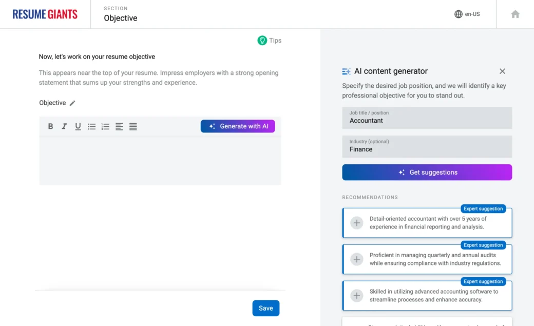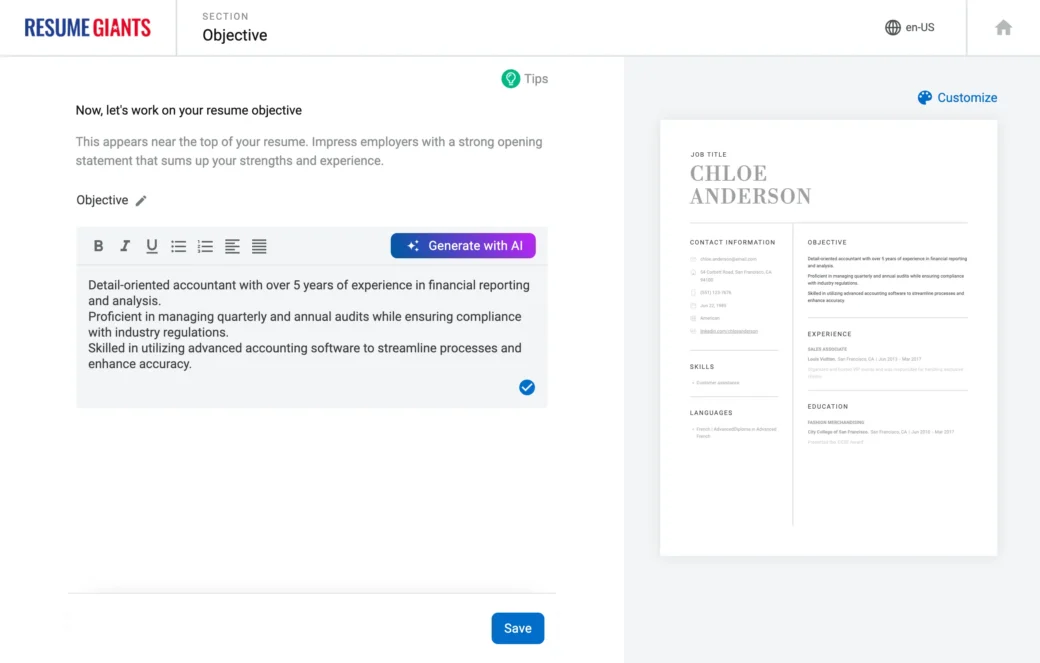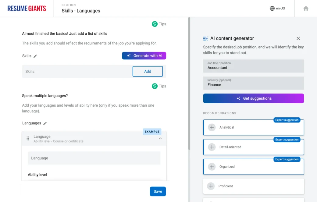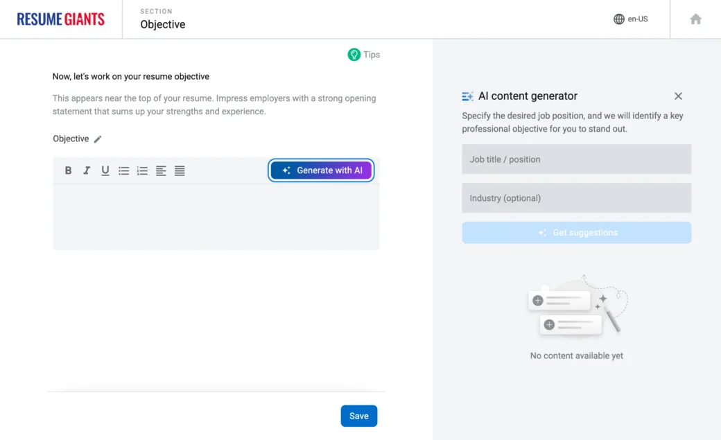 Fill in the job title you are applying for in ResumeGiants’ free resume builder, or upload your resume into our tool.